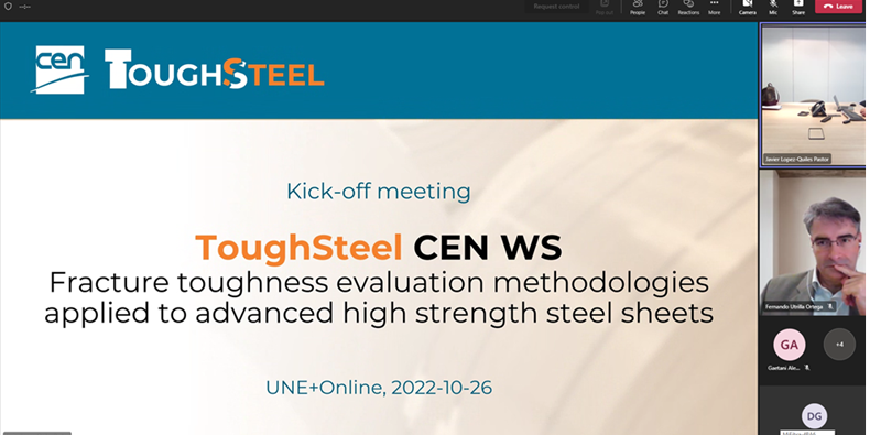 As part of its standardisation activities, the ToughSteel project has kick-started a CEN-CENELEC workshop on fracture toughness evaluation methodologies applied to advanced high strength steel sheets. The initial meeting was held on October 26th on a hybrid format, both online and on the headquarters of the Spanish Association for Standardisation (UNE), organiser of the event.